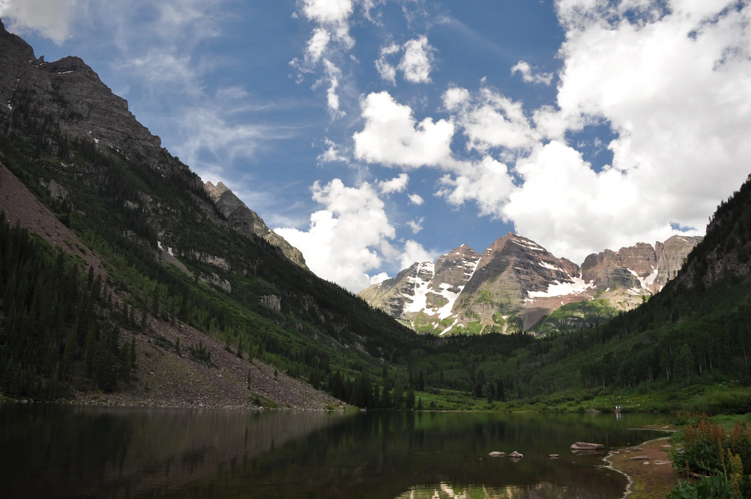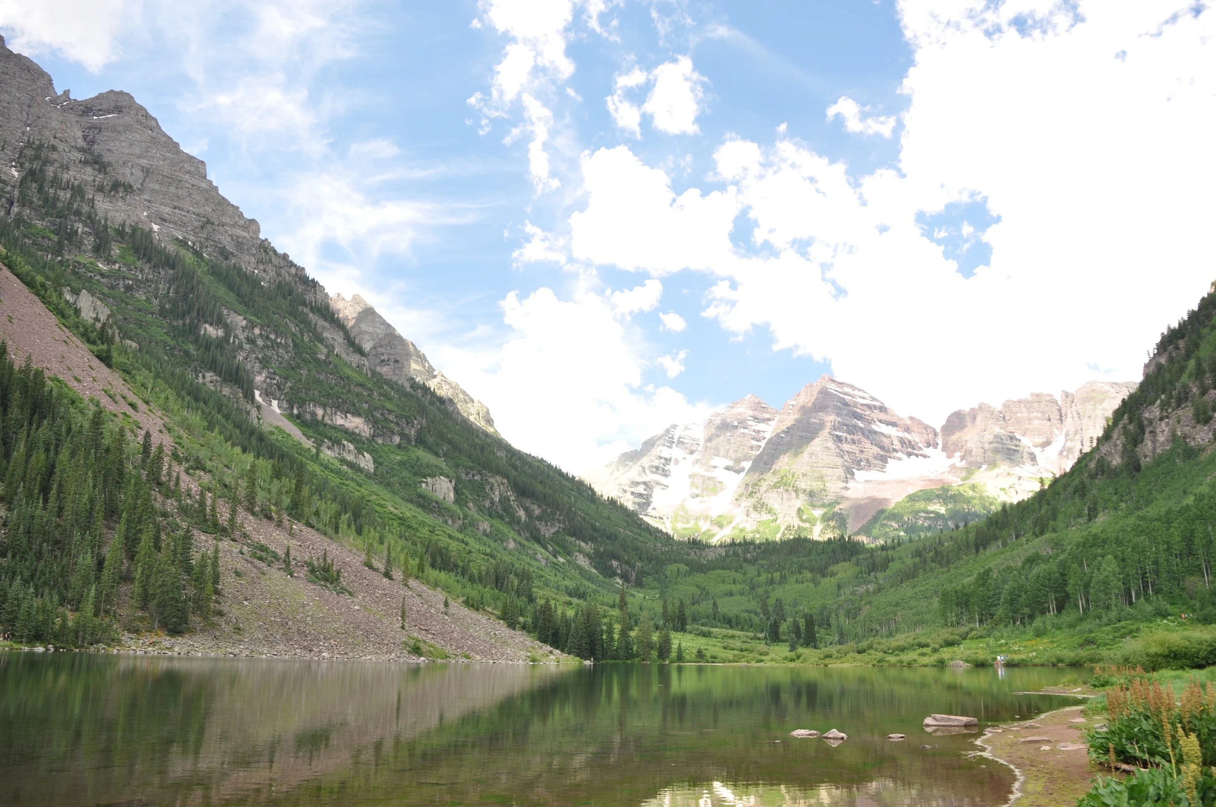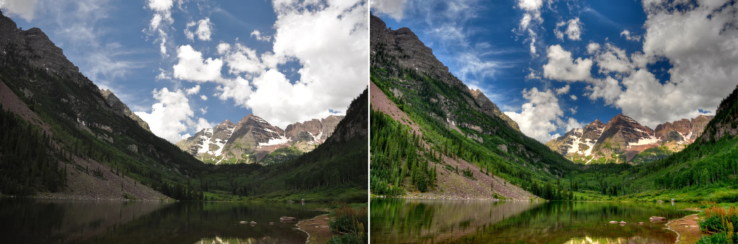 Before I get into the details, let me show you how HDR processing can help with landscape photography. Below is a snapshot of the Maroon Bells near Aspen, Colorado, using my camera’s auto-exposure setting. With brightly lit mountains in the background and shadowed trees in the foreground, this scene illustrates the classic auto-exposure dilemma: the camera does its best to choose the exposure automatically, but the picture loses a lot of detail because the lighter features are over-exposed and the foreground is under-exposed.